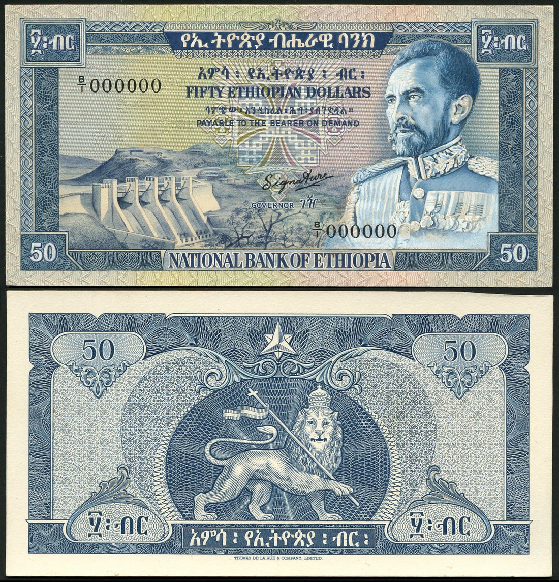 (†) National Bank of Ethiopia, obverse and reverse composite essay on card for a 50 Dollars, ND (c1966), serial number B/1 000000, deep blue on multicoloured underprint, Emperor Haile Selassie at right, Koka High Dam at left, reverse arms of the Lion of Judah