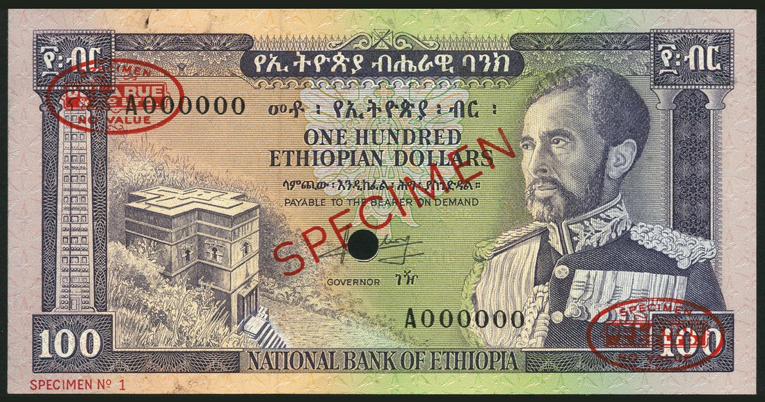 (†) National Bank of Ethiopia, specimen 50 Dollars (2), ND (1966), the first serial number A000000, specimen No 1, the second serial number B000000, specimen No 001, both blue on multicoloured underprint, Emperor Haile Selassie at right, Koka High Dam at left; also specimen 100 Dollars (2), ND (1966), both serial number A000000, one specimen No 1 and one specimen No 001, both purple and green on multicoloured underprint, Emperor Haile Selassie at right, rock church at left, all reverse arms of the Lion of Judah, all overprinted SPECIMEN in red with two specimen De La Rue ovals on obverse and reverse