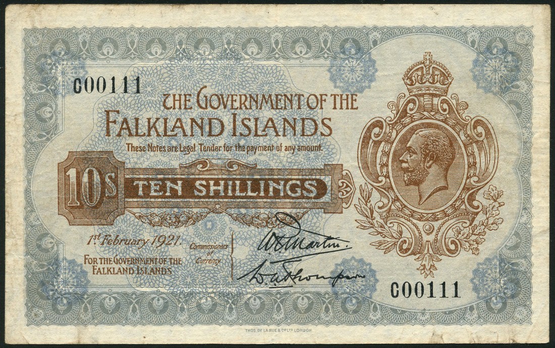 (x) Government of The Falkland Islands, 10 Shillings, 1 February 1921, serial number C 00111, signature William Paulin Martin and William Austin Thompson, brown on grey underprint, portrait of King George V at right, value at left, reverse ornate geometric pattern