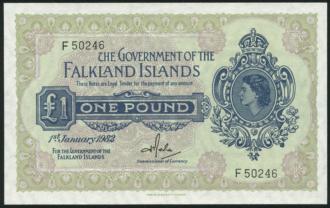 (x) Government of the Falkland Islands, £1, 1 January 1982, serial number F 50246, green and lilac, Elizabeth II at right