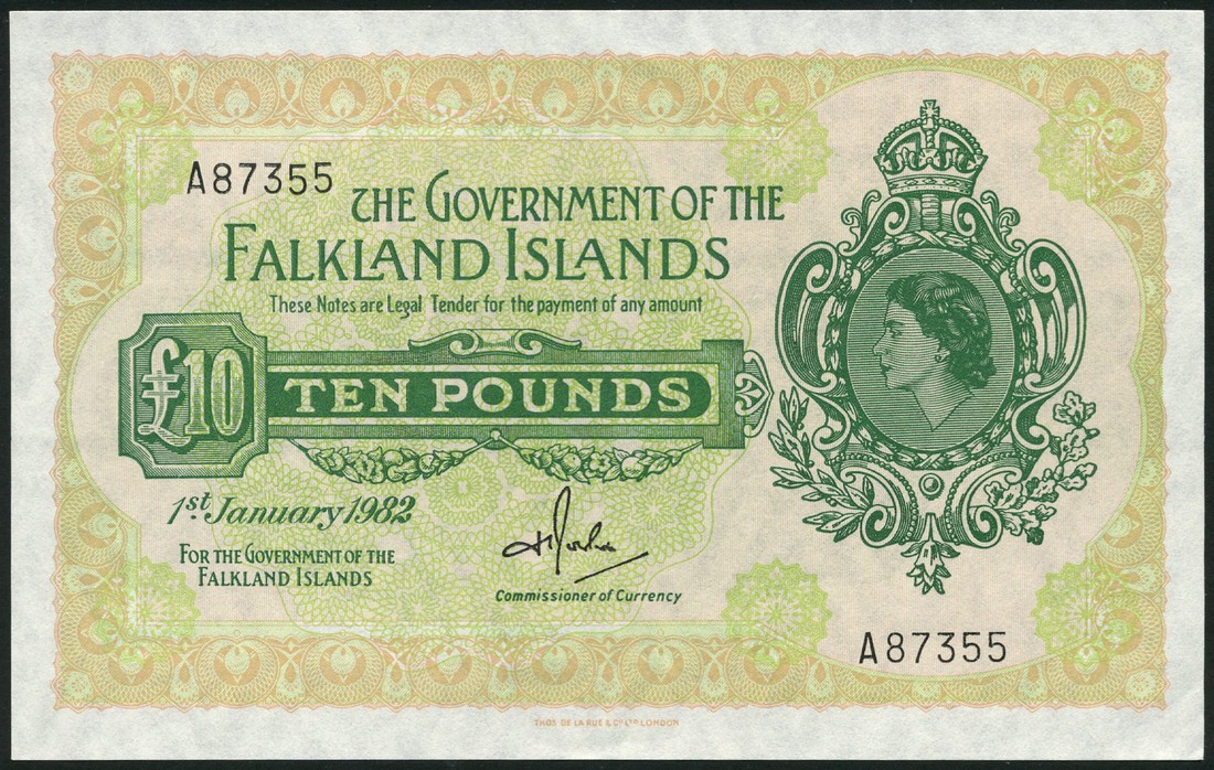Government of the Falkland Islands, £10, 5 June 1975, serial number A 87355, green and pale orange, Elizabeth II at right, value left centre, Rowlands signature, reverse green