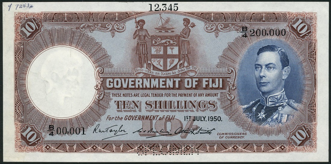 (x) Government of Fiji, printers archival specimen 10/-, 1 July 1960, serial range B/4 00,001 to B/4 200,000, brown and blue, George VI at right, arms at top centre, value at centre and each corner, perforated SPECIMEN