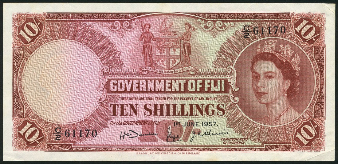 (x) Government of Fiji, 10 Shillings, 1 June 1957, serial number C/2 61170, signature Davidson, Griffiths, Marais, brown on green, pink and yellow underprint, portrait of Queen Elizabeth II at right, coat of arms at upper centre, value at lower centre and in each corner, reverse ornate geometric patterns