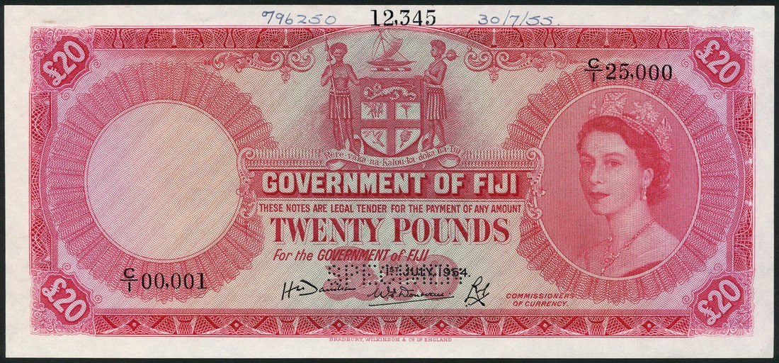 (†) Government of Fiji, specimen £20, 1 July 1954, serial number C/1 00001-C/1 25000, red and pale blue-green, Elizabeth II at right, arms top centre, value at centre and at each corner, signatures of Davidson, Donovan and Davis, reverse red, bank title and value at centre