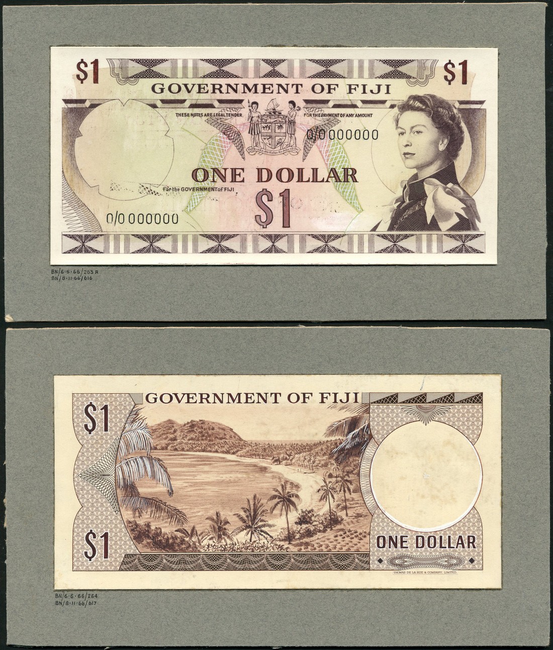 (†) Government of Fiji, an obverse and reverse composite essay on board for a $1, ND (1966), serial number 0/0 000000, brown on multicoloured underprint, portrait of Queen Elizabeth II by Pietro Annigoni at right, arms at upper centre, reverse Yanuca Beach