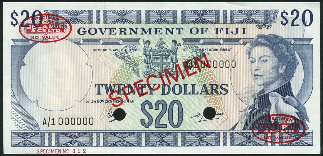 (†) Government of Fiji, specimen $20, ND (1969), serial number A/1 000000, signature Ritchie and Barnes, blue on multicoloured underprint, portrait of Queen Elizabeth II by Pietro Annigoni at right, arms at upper centre, reverse geometric pattern, overprinted SPECIMEN in red with two De La Rue specimen ovals on obverse and reverse