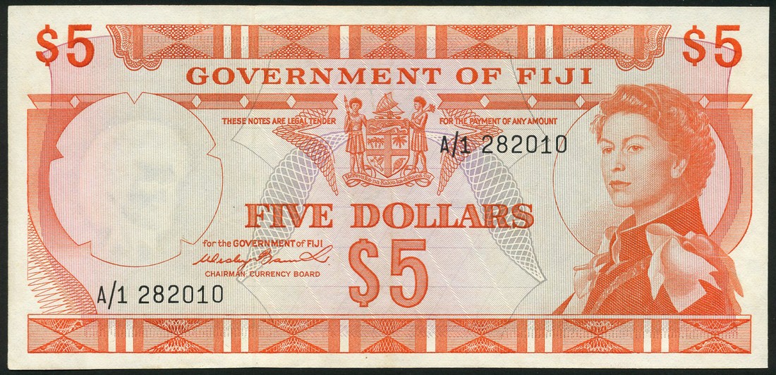 Government of Fiji, $2, prefix A/4, green and pale orange, also $5, prefix A/1, both ND (1971-), both Elizabeth II and arms and signature of Wesley Barrett