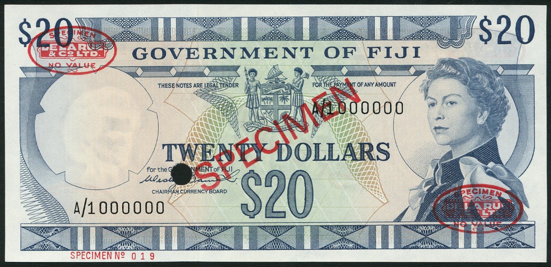 (†) Government of Fiji, specimen $20, ND (1969), serial number A/1 000000, signature Wesley Barrett, blue on multicoloured underprint, portrait of Queen Elizabeth II by Pietro Annigoni at right, arms at upper centre, reverse geometric pattern, overprinted SPECIMEN in red with two De La Rue specimen ovals on obverse and reverse