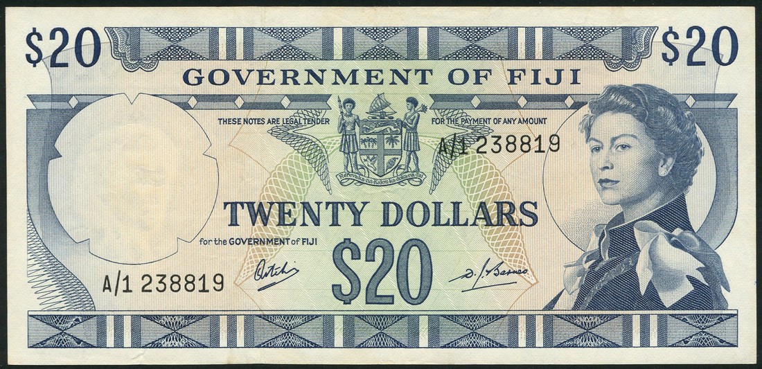 Government of Fiji, $20, prefix A/1, ND (1968), blue pale green, Elizabeth II and arms and signatures of Ritchie and Barnes