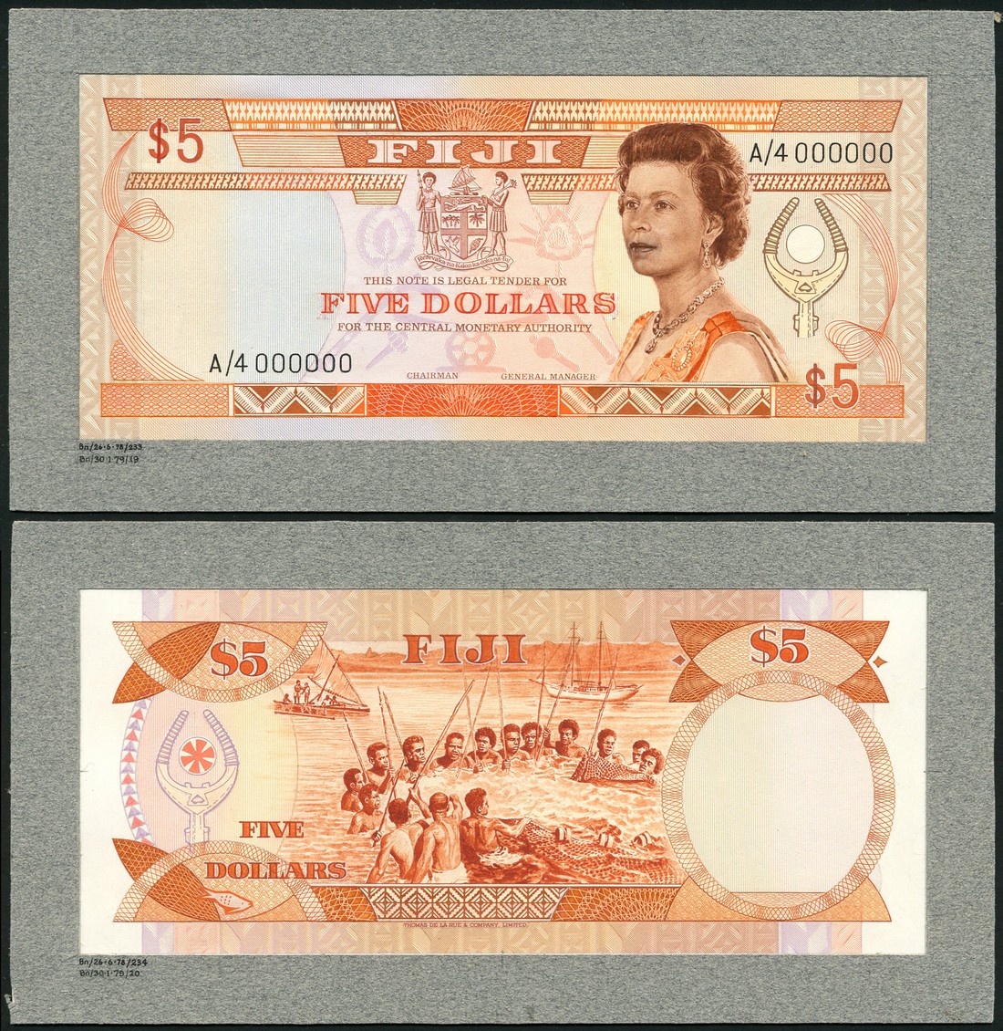(†) Central Monetary Authority, Fiji, an obverse and reverse composite essay on card for a $5, ND (1979), serial number A/4 000000, orange and brown on multicoloured underprint, portrait of Queen Elizabeth II at right, arms at upper centre, artefact with circle at right, reverse circle of fishermen with net