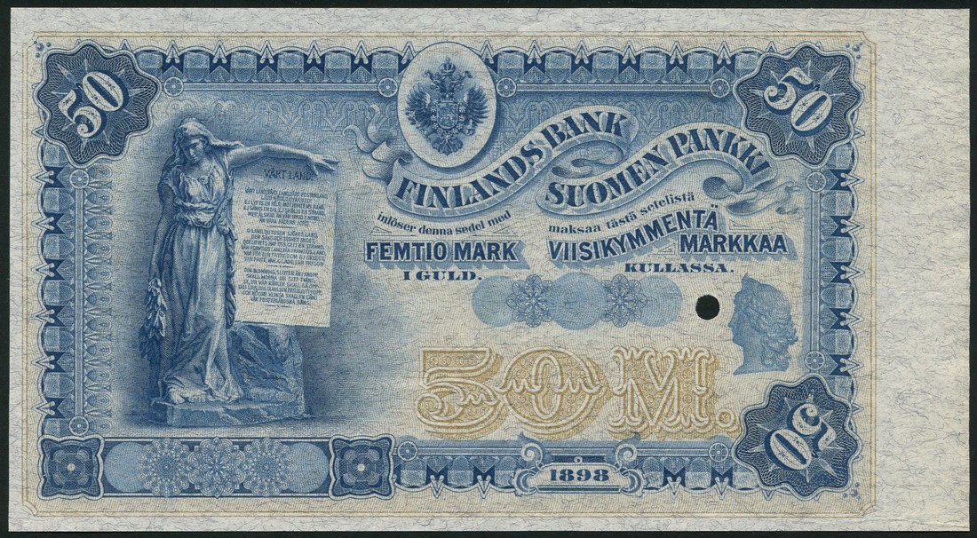 (†) Finlands Bank, specimen 50 markkaa, 1898, no serial numbers blue on tan underprint, statue of woman with stone tablet at left, arms at top centre, one cancellation hole