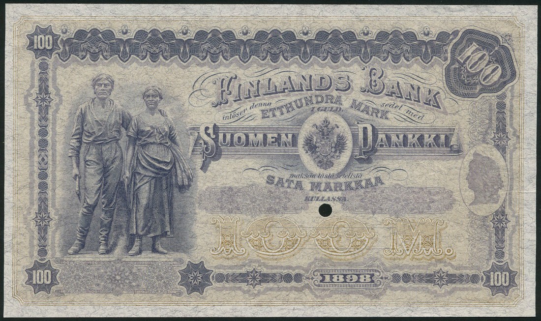 (†) Finlands Bank, specimen 100 markkaa, 1898, blue and beige, allegorical farming couple at left, 100M in pale brown underprint low right centre, arms at centre, medallic female head at right, small cancellation hole
