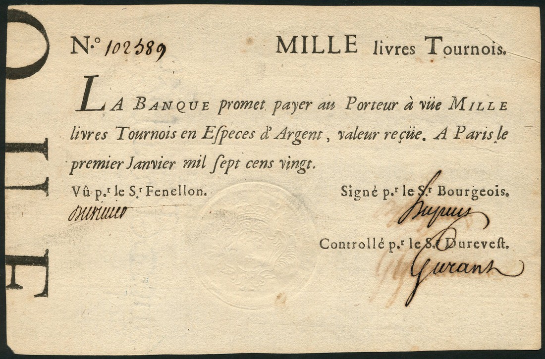 (x) Le Banque Royale, 1000 livres, 1 January 1720, serial number 102589, black and white, three manuscript signatures, embossed revenue stamp at centre