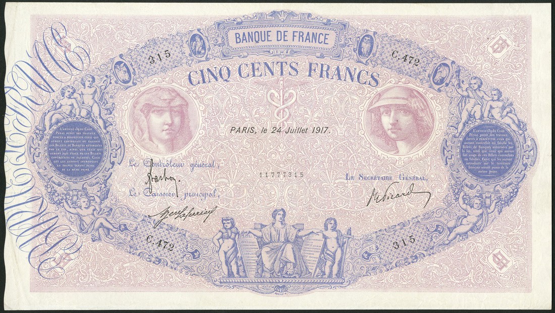 (x) Banque de France, 500 francs, 24 July 1917, serial number C.472 315, pink and blue, woman at left, Mercury at right, allegorical figures at low centre and in border