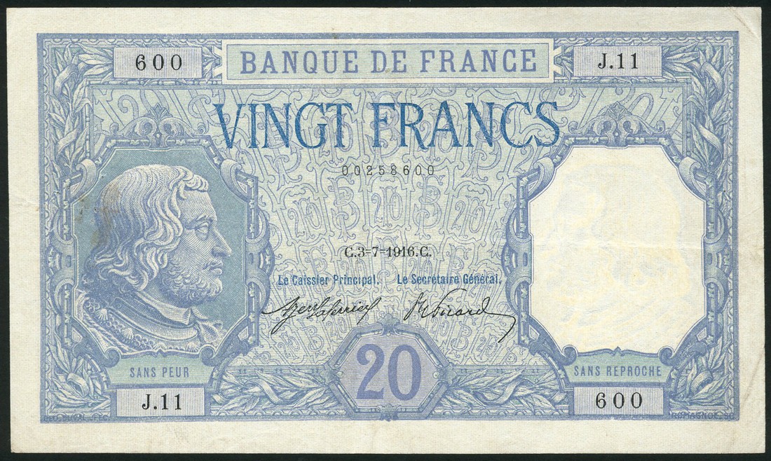(x) Banque de France, 20 francs, 3 July 1916, serial number J.11 600, blue, Bayard at left, value at low centre, reverse farmer with scythe