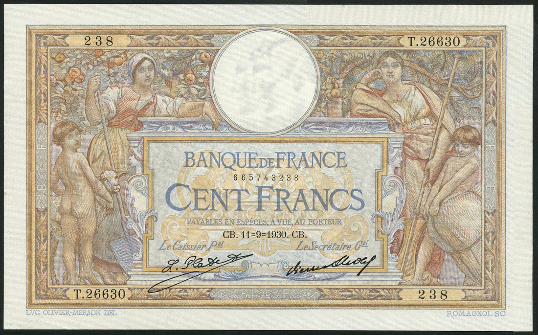 (x) Banque de France, 100 francs, 11 September 1930, serial number T.26630 238, multicolour, women and children at left and right