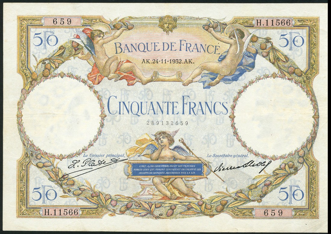 (x) Banque de France, 50 francs, 24 November 1931, serial number H.11566 659, multicolour, Mercury at low centre, cherubs at top left and right, value at each corner