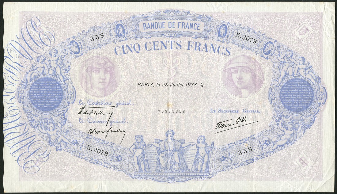 Banque de France, 500 Francs, 28 July 1938, serial number X.3079 358, blue on pink underprint, ornate oval border with cherubs and animals, three figures centre bottom, woman at left, Mercury at right, obverse ornate oval border with cherubs and allegorical figures