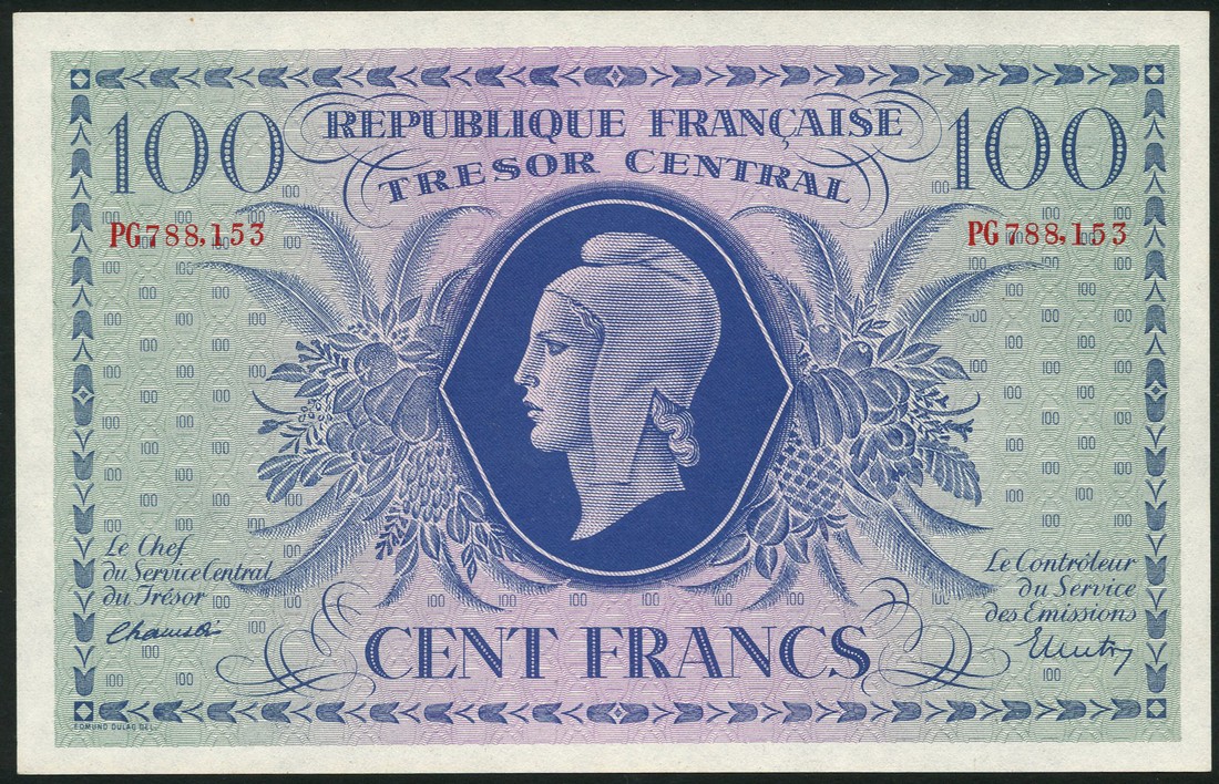 (x) Republique Francaise, Tresor Central, 100 francs, 2 October 1943, serial number PG 788,153, dark blue on green and pink underprint, Marianne at centre