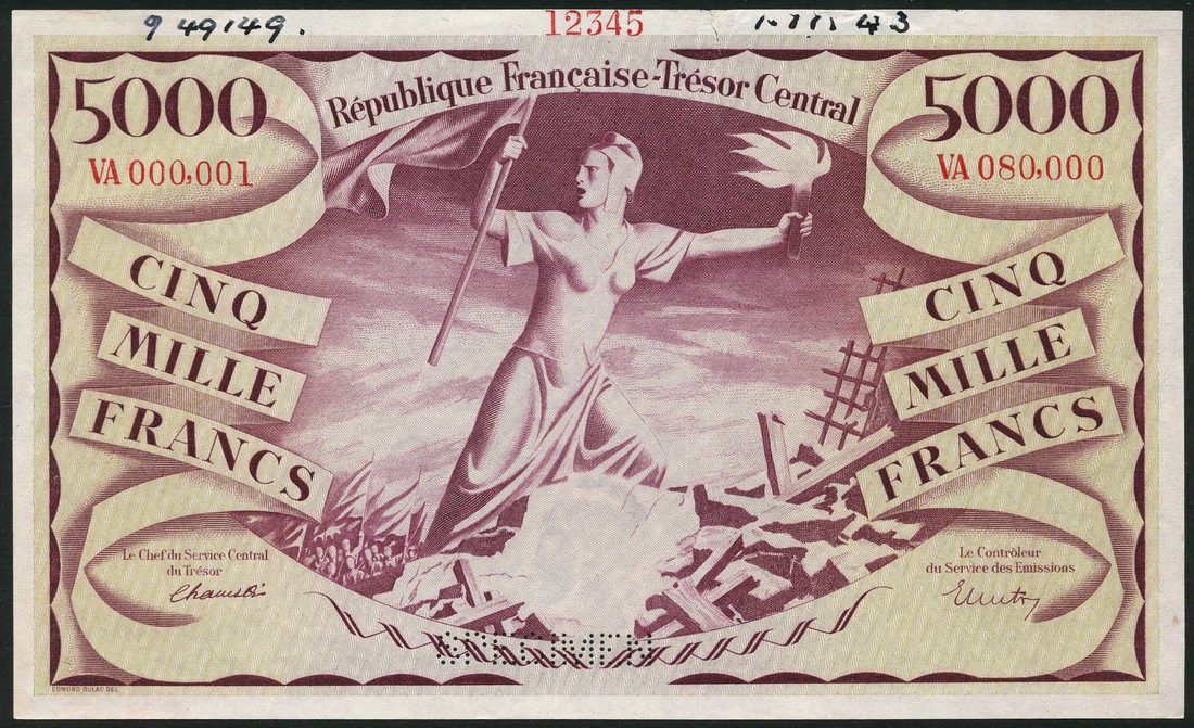 (†) Republique Francaise, Tresor Central, specimen 5000 francs, ND (1943), red serial number VA 000001- VA 080000, purple and pale green, Marianne at centre with torch of Liberty, value at left and right, reverse purple and pale green, scales, sword and document at centre, value low left and right