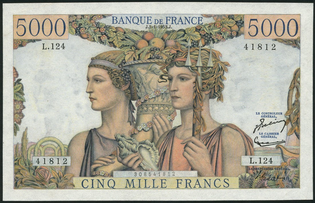 (x) Banque de France, 5000 francs, 2 January 1953, serial number L.124 41812, multicolour, two female allegories of the countryside and the ocean at centre, reverse Mercury and another female allegory at centre