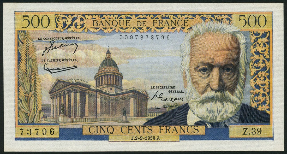 (x) Banque de France, 500 francs, 2 September 1954, Z.39 73796, multicolour, Victor Hugo at right