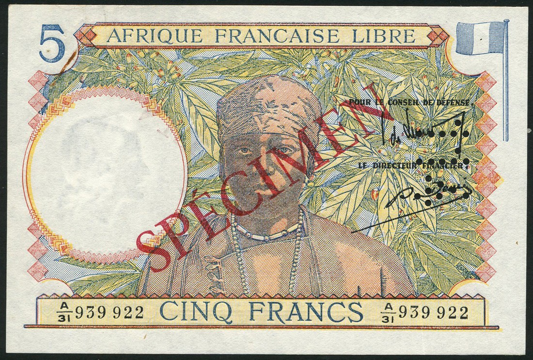 (x) Afrique Francaise Libre, French Equatorial Africa, specimen 5 francs, ND (1941), prefix A/31, multicoloured, man at centre, flag top right, reverse pink, man at loom