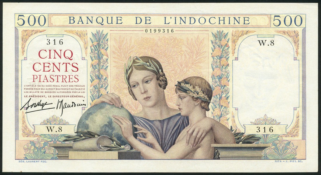 (x) Banque de L'Indochine, French Indo-China, 500 francs, ND (1939), serial number W.8 316, multicolour, woman and child with globe at centre, reverse same scene with elephants behind