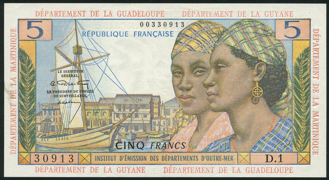 (x) Institut d'Emission des Departments d'Outre-Mer Republique Francaise, 5 francs, ND (1964), serial number D.1 30913, multicolour, two women at right, ship in harbour at left, reverse ox carts loaded with goods