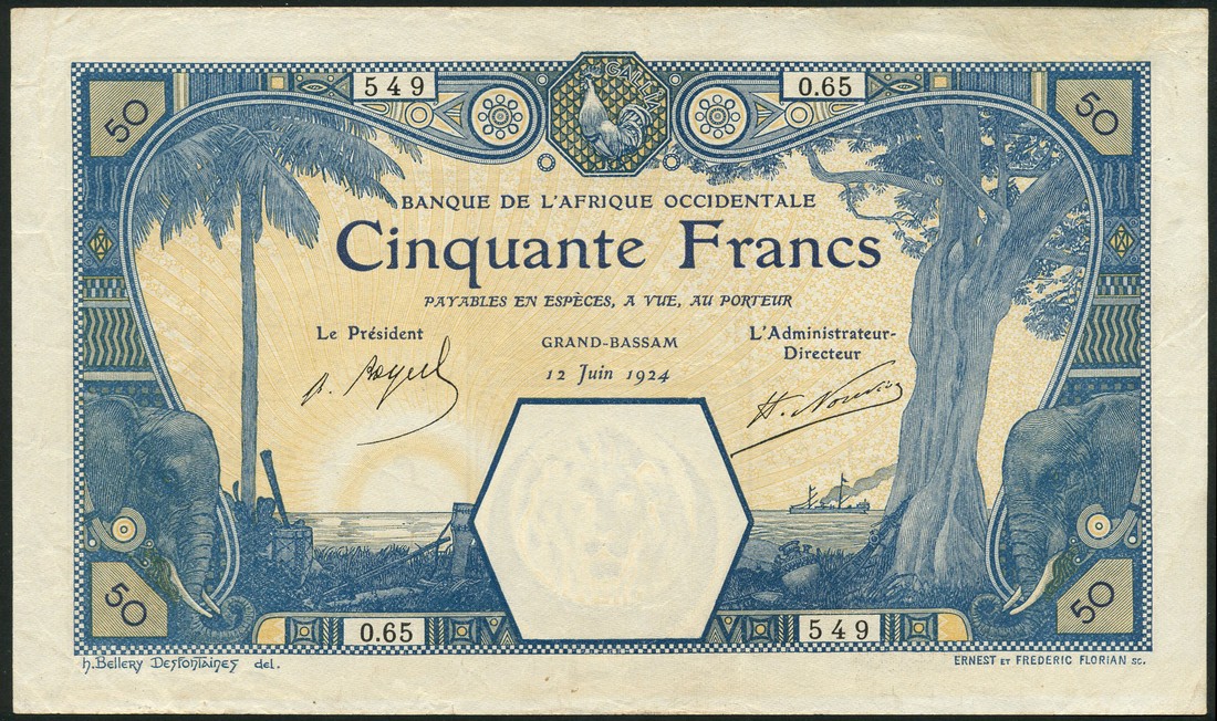 (x) Banque de l'Afrique Occidentale, French West Africa, 50 francs, Grand-Bassam, 12 june 1924, serial number O.65-549, blue and pale orange, allegorical symbols of Africa in borders, reverse pale blue and white