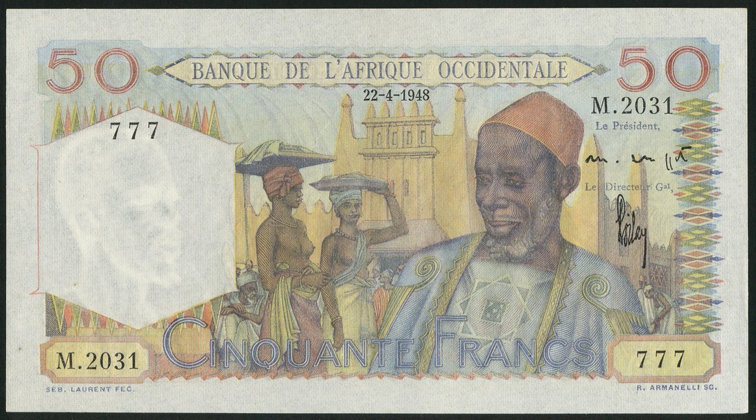 (x) Banque de L'Afrique Occidentale, 5 francs, 6 May 1942, serial number K.9447 638, 5 francs (2), 17 August 1943, serial number X.46 78267, 10 francs, 21 November 1953, serial number Y.110 27441, 25 francs, 19 December 1952, serial number H.9435 988, 50 francs, 22 April 1948, serial number M.2031 777,