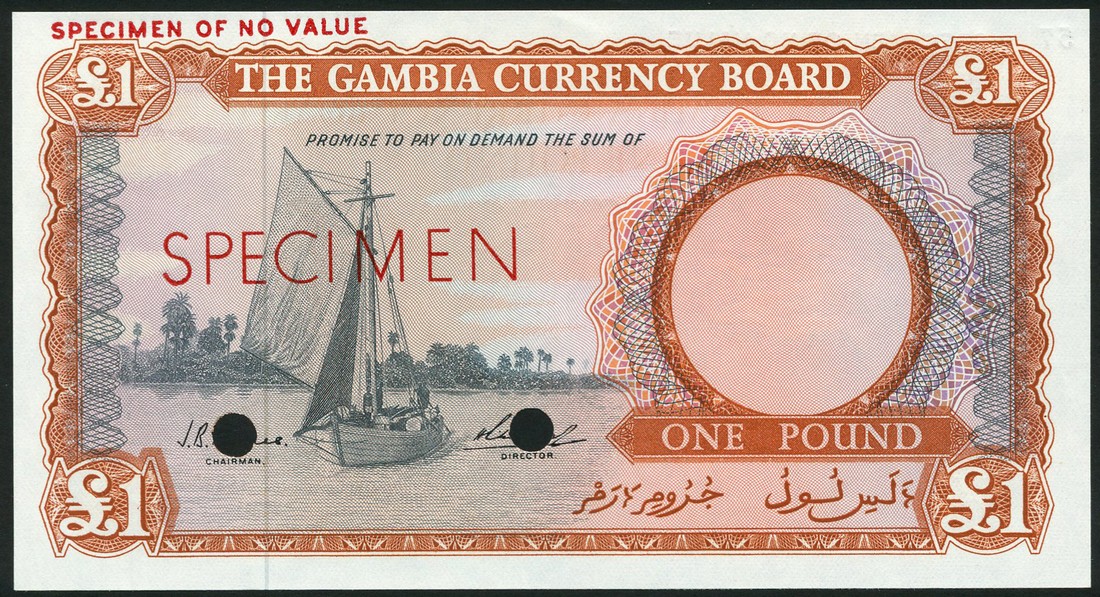 (†) Central Bank of the Gambia, specimen colour trial 10 Shillings, ND (1965-70), blue and green on multicoloured underprint, sailing boat at left, reverse, blue, workers in field; also specimen colour trial 1 Pound, ND (1965-70), yellow-brown and grey on pink underprint, sailing boat at left, reverse yellow-brown, loading sacks at dockside, both overprinted SPECIMEN in red on obverse and reverse, two punch holes