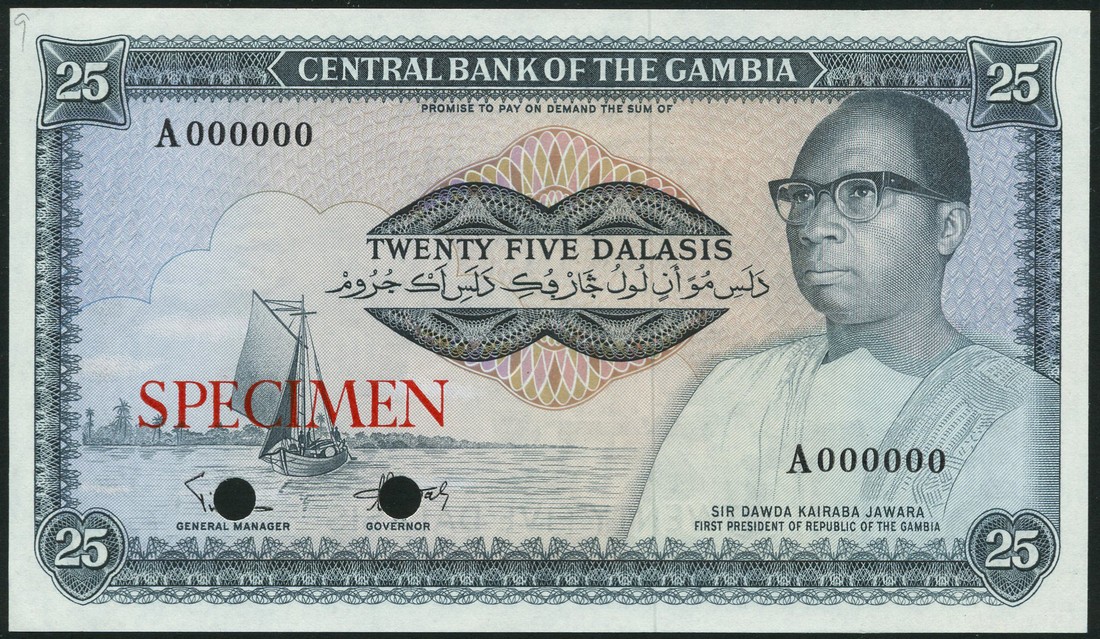 (†) Central Bank of The Gambia, a group of specimen colour trials of the ND (1972-86) Issue, all Sir Dawda Kairaba Jawara at right, all A000000 serial numbers, comprising 1 Dalasi, signature 2, red, reverse field workers; 10 Dalasis, signature 3, purple-brown, reverse fishermen; and 25 Dalasis, signature 2, slate, reverse farm machinery, all overprinted SPECIMEN in red or black on obverse and reverse, two punch holes