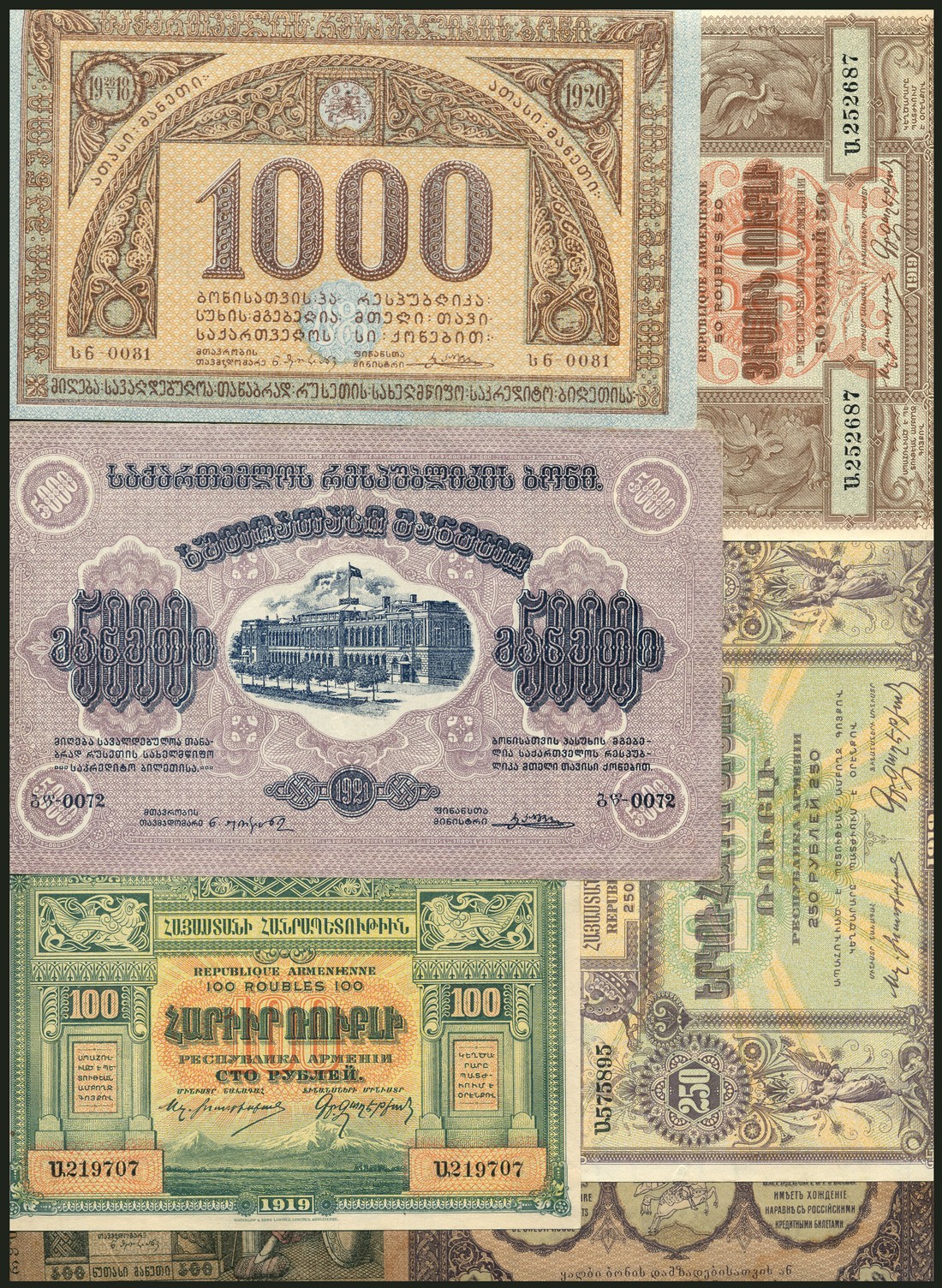 Georgia, Autonomous Region, 5 and 500 rubles, 1919, 1000 rubles, 1920 and 5000 rubles, 1921, also Armenia Autonomous Republic 50,100,250 rubles, 1919