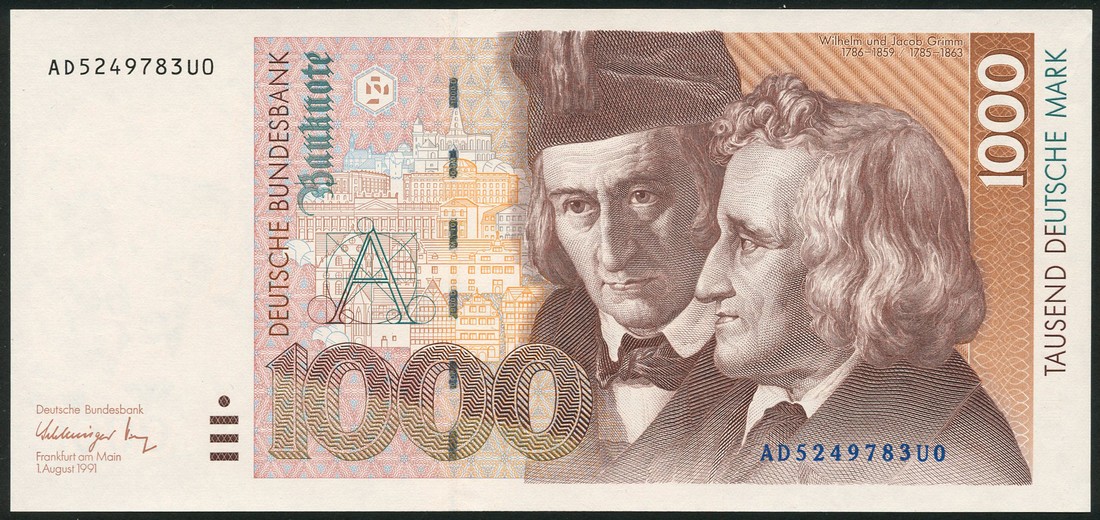 Deutsche Bundesbank, 1000 mark, 1 August 1991, serial number AD5249783UO, reddish brown, building centre left, the Grimm brothers at right, , reverse bank logo at left, Royal Library and book at centre, girl catching stars bottom right