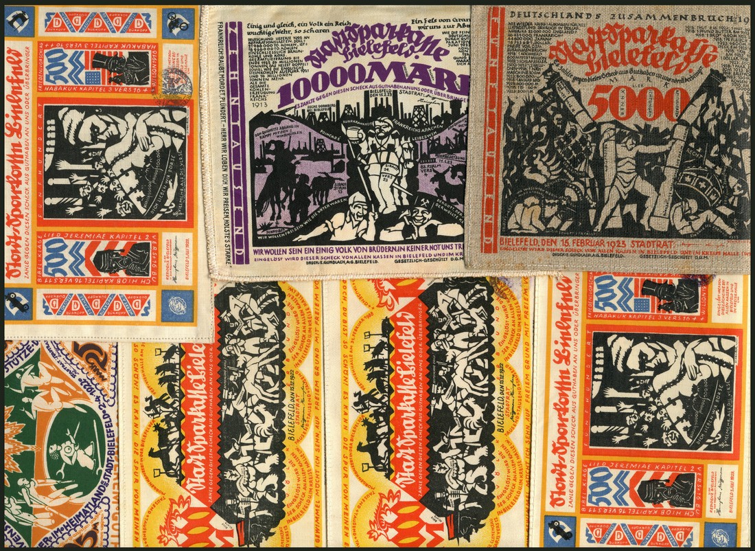 Stadt-Sparkasse Bielefeld, a selection of silk notes comprising 25 mark (3), 7.21/4.22, 50 mark, 4.22, 500 mark (3), 7.23,10.23, 1000 mark (2), 12.22, 5000 mark, 2.23, 10000 mark, uniface reverse