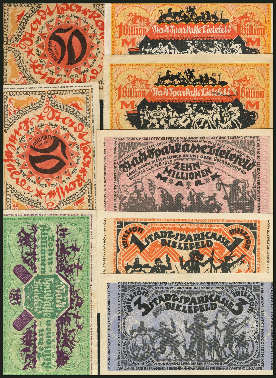Stadt-Sparkasse Bielefeld, a selection of notgeld comprising 50 million mark (3), 4.1922, 250 million, 4.1922, 1 billion (2), 12.1922, 10 billion, 12.1922 and 1 milliarde mark, 2.1923, also 1,3,5 and 10 million mark, 8.1923