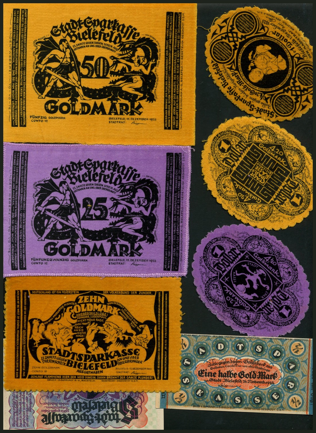 Stadt-Sparkasse Bielefeld, a selection of gold mark comprising 1/2 mark, 1.05 gold mark, November 1923, 4.20 gold mark (2), December 1923,10,25 and 50 goldmark, December 1923, all on silk