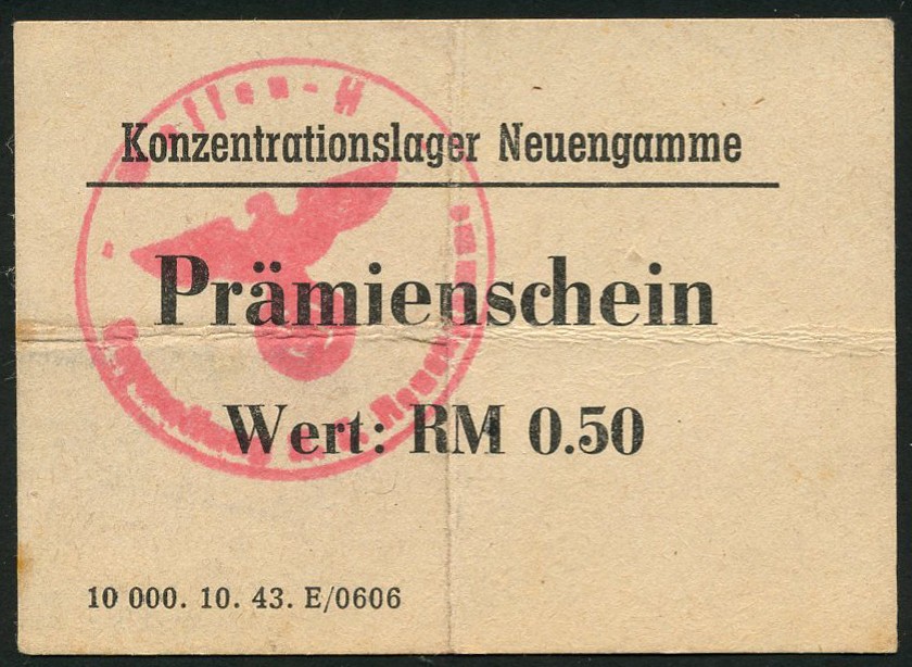 Neuengamme, 0.50 reichsmarks Pramienschein, 1943-45 general issue, black on cream coloured thin card, pink handstamp