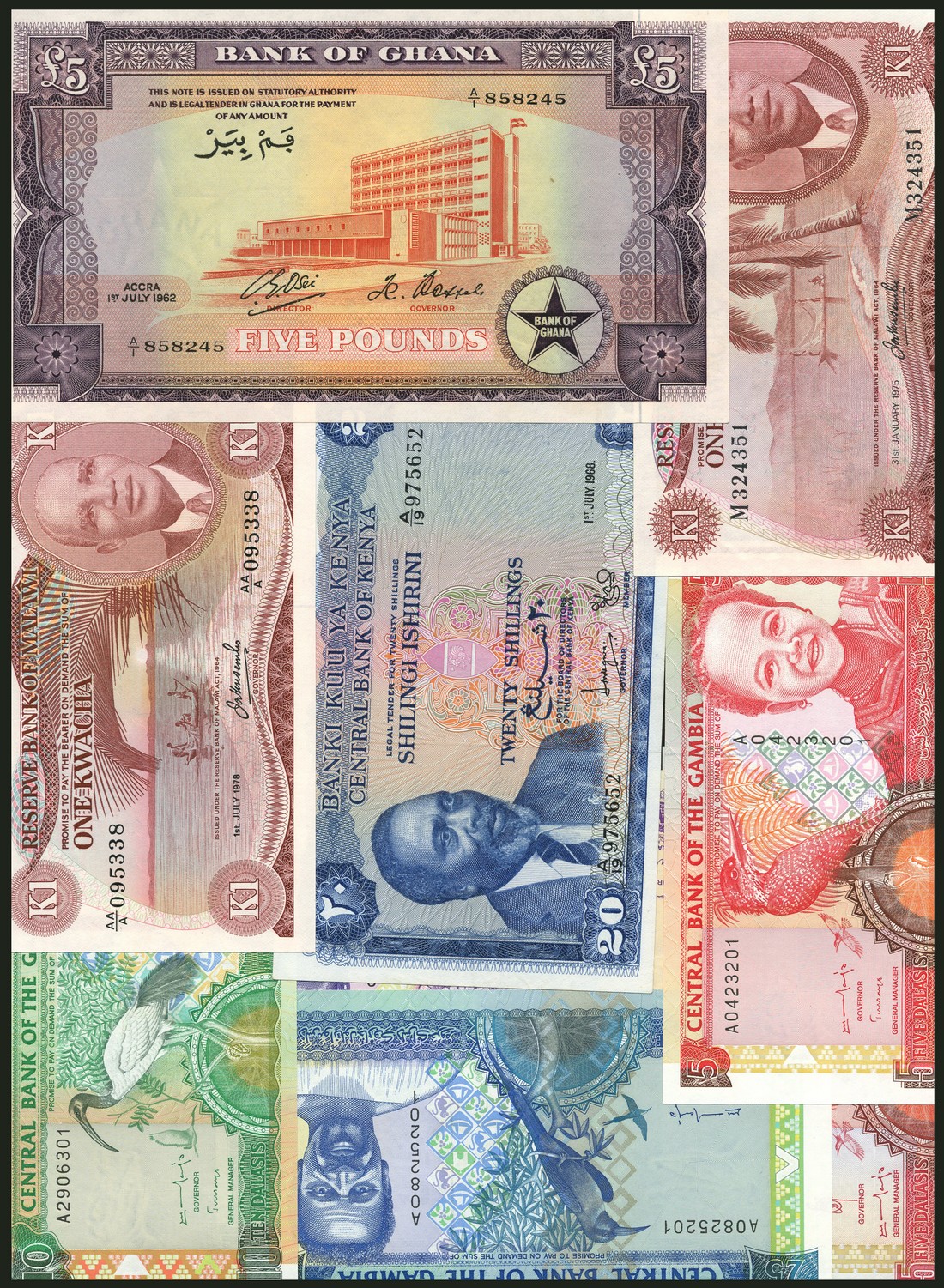 Bank of Ghana, £5, 1962, purple, bank building at right, Gambia, a set of te 1989-1995 series and a set of the 1996 series, each with 5,10,25 and 50 dalasi, Malawi 1 kwacha (2), 1975 and 1978, Kenya 5/-, 1967 and 20/-, 1968, both Kenyatta at left