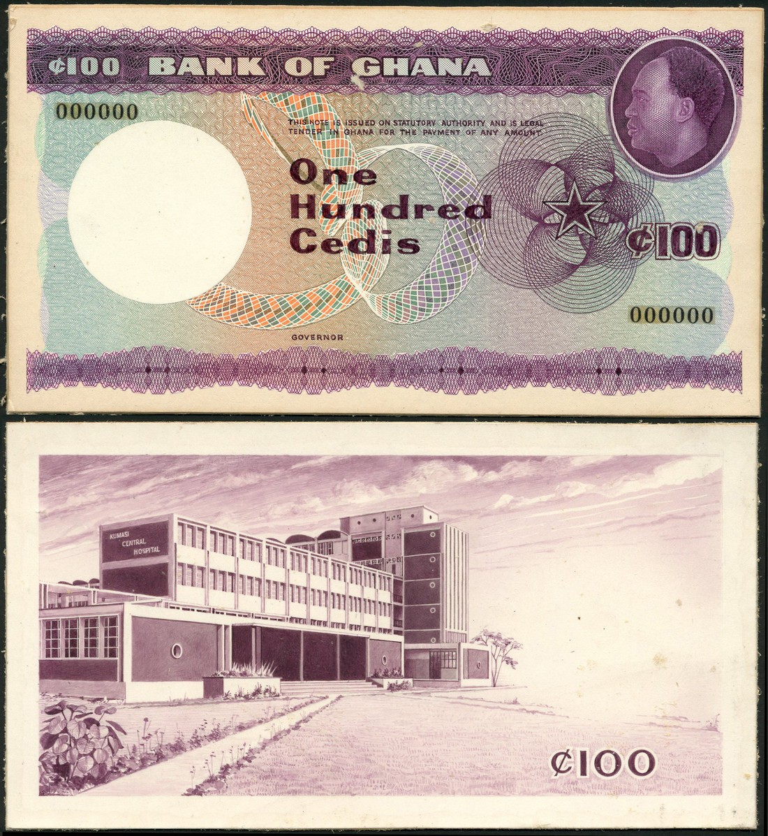 (†) Bank of Ghana, obverse and reverse composite essay on card for a 100 Cedis, ND (c1965), serial number 000000, purple on multicoloured underprint, portrait of Kwame Nkrumah at upper right, value at upper left and right, Ghana star at right, reverse Kumasi Central Hospital, value at lower right