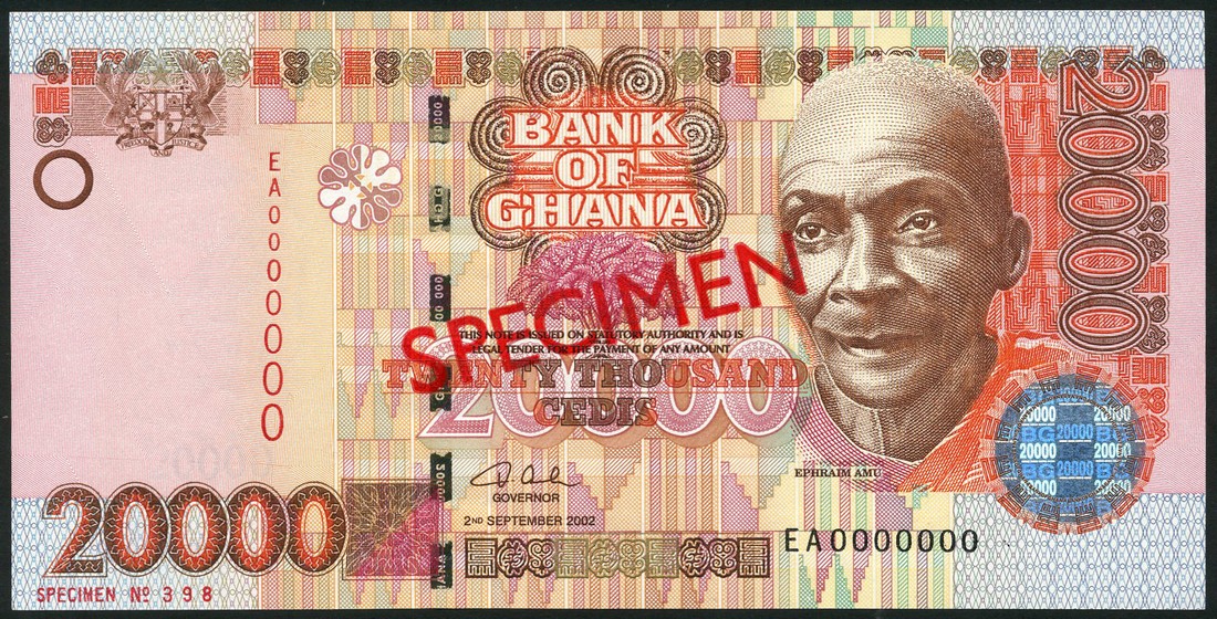 Bank of Ghana, Group of specimen notes consisting of 20000 cedis, 2002, 10000 cedis, 2002, 5000 cedis, 1996, 2000 cedis, 1997, 1000 cedis, 1996, all zero serial numbers and all red stamped SPECIMEN on obverse and reverse