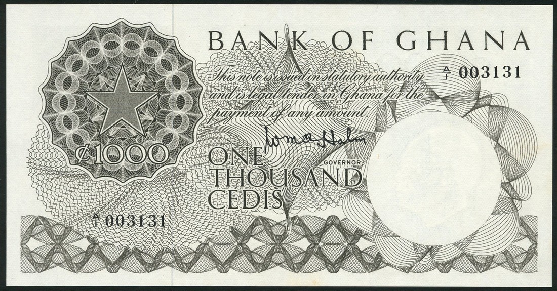 Bank of Ghana, 1000 Cedis, ND (1965), serial number A/I 003131, black on cream underprint, large star at upper left, signature 3, reverse Bank of Ghana in Accra