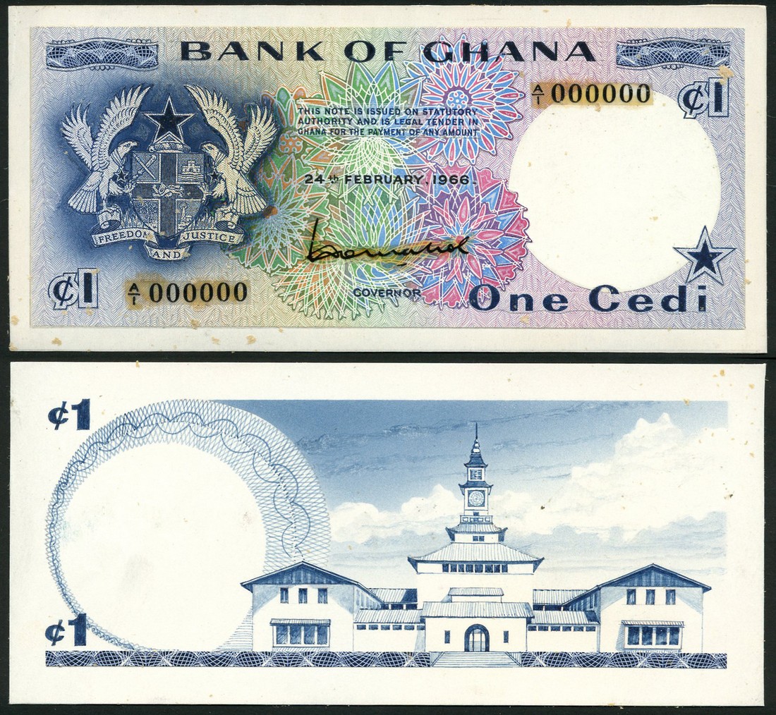 (†) Bank of Ghana, obverse and reverse composite essay with artwork on card for a 1 Cedi, 24 February 1966, serial number A/1 000000, blue and multicoloured, arms of Ghana at left, ornate pattern at centre, Ghana star at lower right, reverse blue, building with clock tower, value at upper and lower left