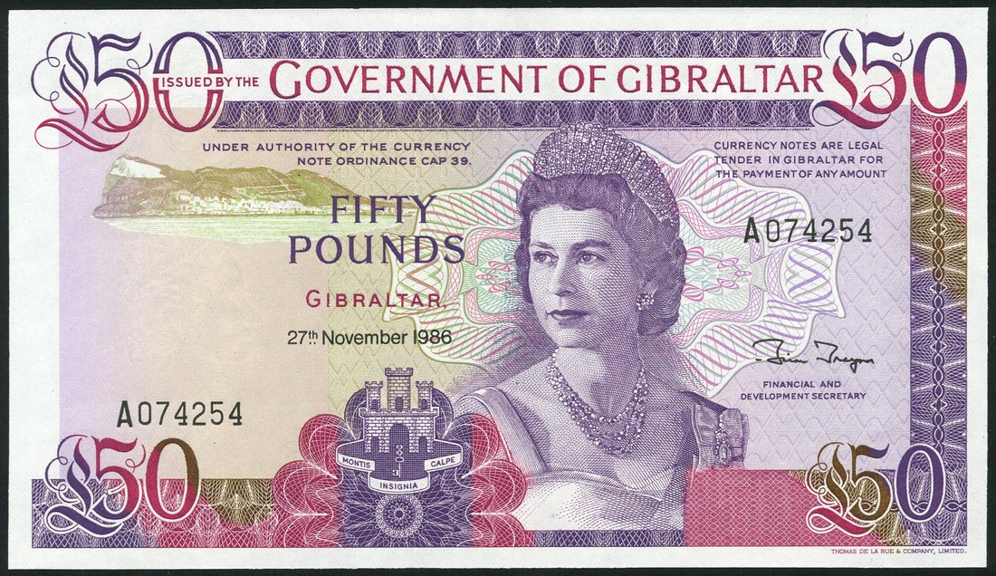 Government of Gibraltar, 10 shillings, 3 October 1958, serial number D325124, £5, 4 August 1988, serial number E843133, £10, 21 October 1986, serial number A918685, £20, 1 July 1986, serial number A999933, £50, 27 November 1986, serial number A074254,