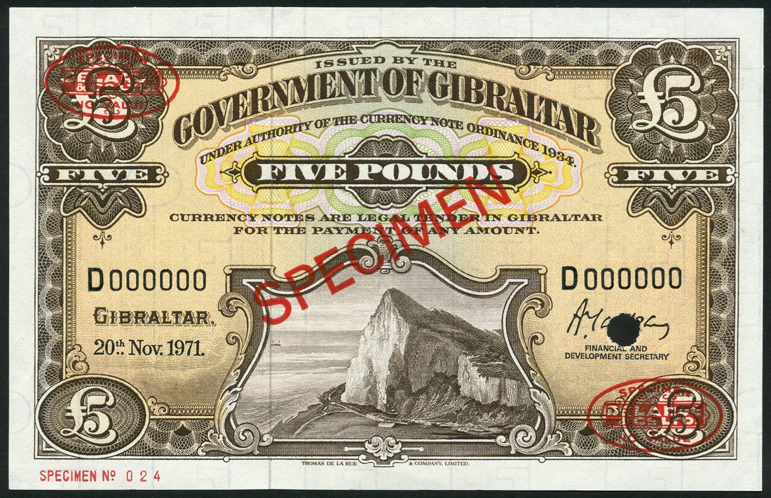 (†) Government of Gibraltar, specimen £5 (2), 20 November 1971 and 20 November 1975, both serial number D000000, brown, Rock of Gibraltar at lower centre, value in each corner, reverse arms at centre, value in ornate guilloches on either side, both overprinted SPECIMEN in red with two De La Rue specimen ovals on obverse and reverse, one punch hole