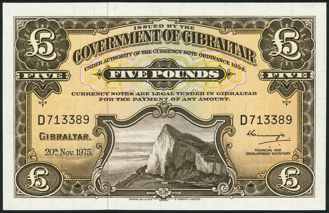 Government of Gibraltar, £5, 20 November 1975, serial number D713389, brown on multicolour, Rock of Gibraltar, reverse coat of arms