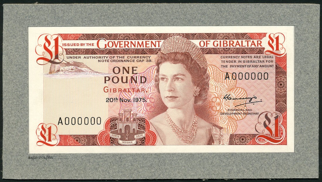 (†) Government of Gibraltar, obverse composite essay on card for a £1, 20 Nov 1975, serial number A000000, brown and red on multicoloured underprint, portrait of Queen Elizabeth II at centre right, Rock of Gibraltar at upper left, arms at lower centre, value in each corner