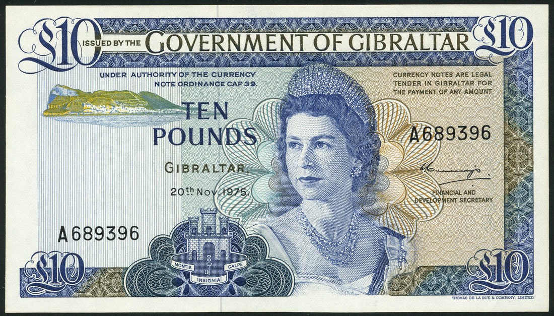 (x) Government of Gibraltar, £1 (3), 15 September 1979, 21 October 1986, 4 August 1988, brown and red; £5 (2), 20 November 1975, 4 August 1988, green and multicoloured, all Queen Elizabeth II at centre right, reverse Governor's House; also £10, 20 November 1975, blue, Queen Elizabeth II at centre right, reverse Parliament House