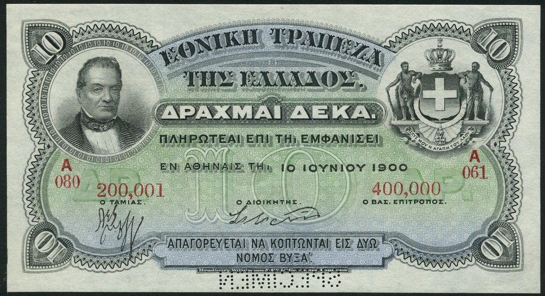 (†) National Bank of Greece, specimen 10 drachmai, 10 June 1900, red serial number A 080-200001-400000 A 061, black, pale blue and green, George Stavros at left, arms of King George I at right, value in underprint low centre, reverse blue, Hermes at centre